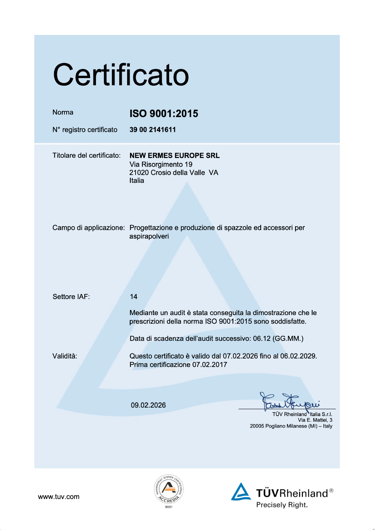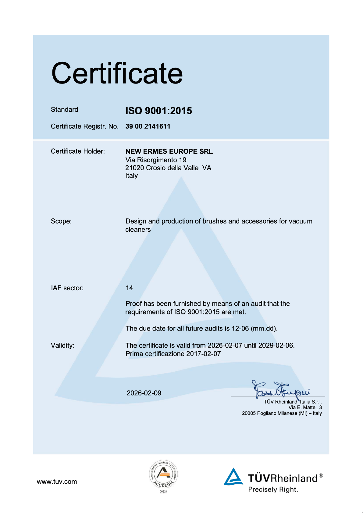 Obiettivo di New Ermes Europe è quello di fornire un altissimo livello qualitativo dei prodotti. Nel corso degli anni la qualità è diventata la chiave del successo della nostra azienda che fornisce, ad una clientela internazionale, spazzole ed accessori ECO Designed, con le migliori performance sempre aggiornate con le disposizioni per la Energy Labelling.